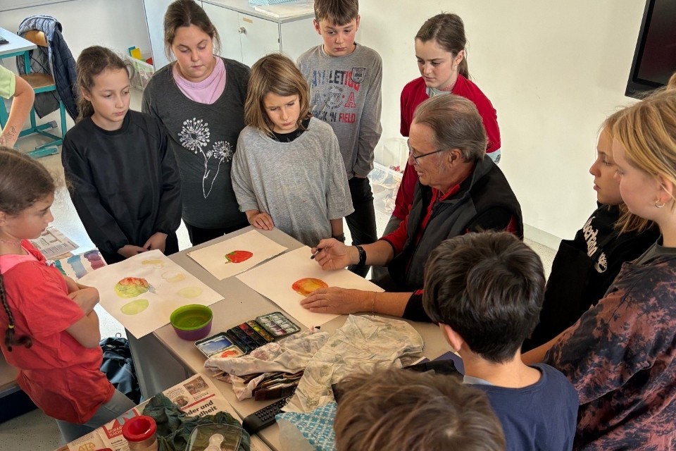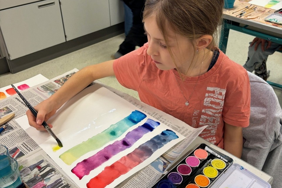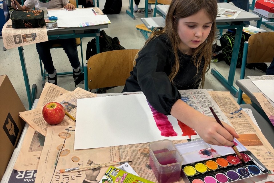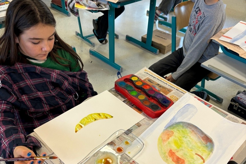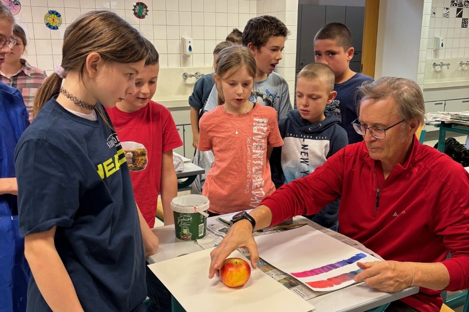 Die Kinder machten Vorübungen mit dem Bleistift, mischten Farben und malten zum Abschluss ihren eigenen Aquarell-Apfel.