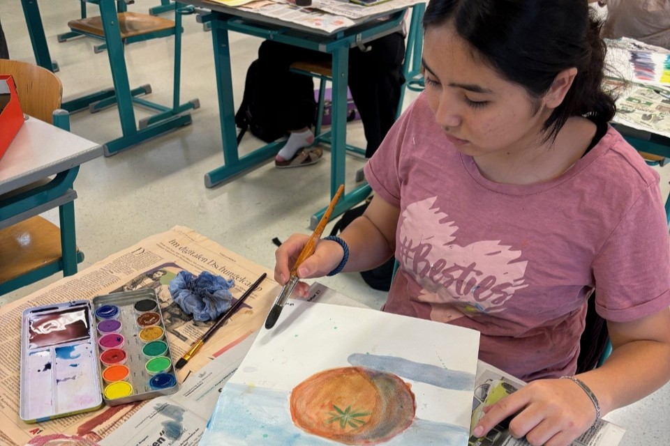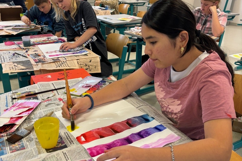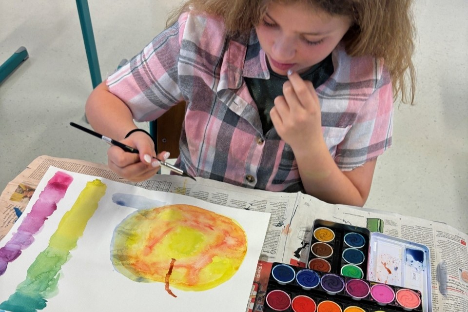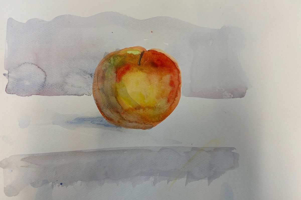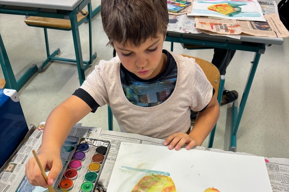Die Kinder machten Vorübungen mit dem Bleistift, mischten Farben und malten zum Abschluss ihren eigenen Aquarell-Apfel.
