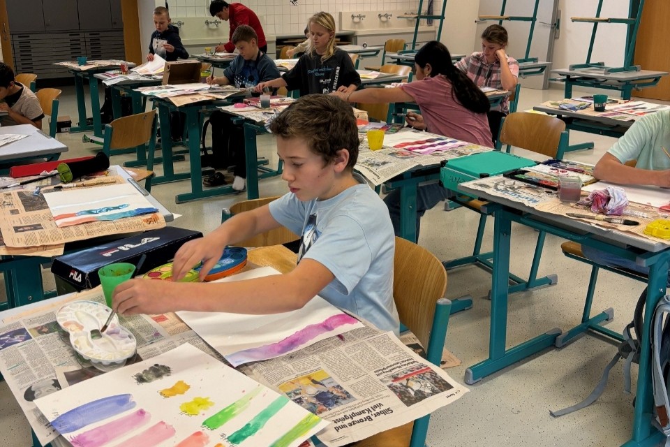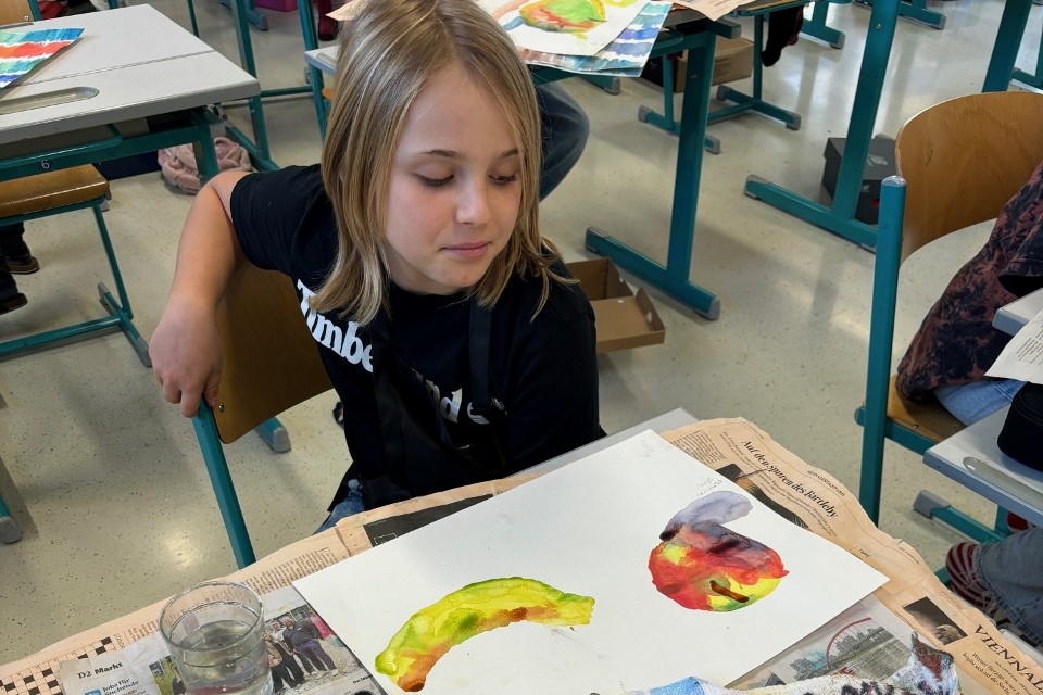 Der Künstler Roland Haas hat die 1a und 1b Klasse mehrmals im Unterricht besucht und ihnen die Grundlagen des Aquarellmalens nähergebracht.